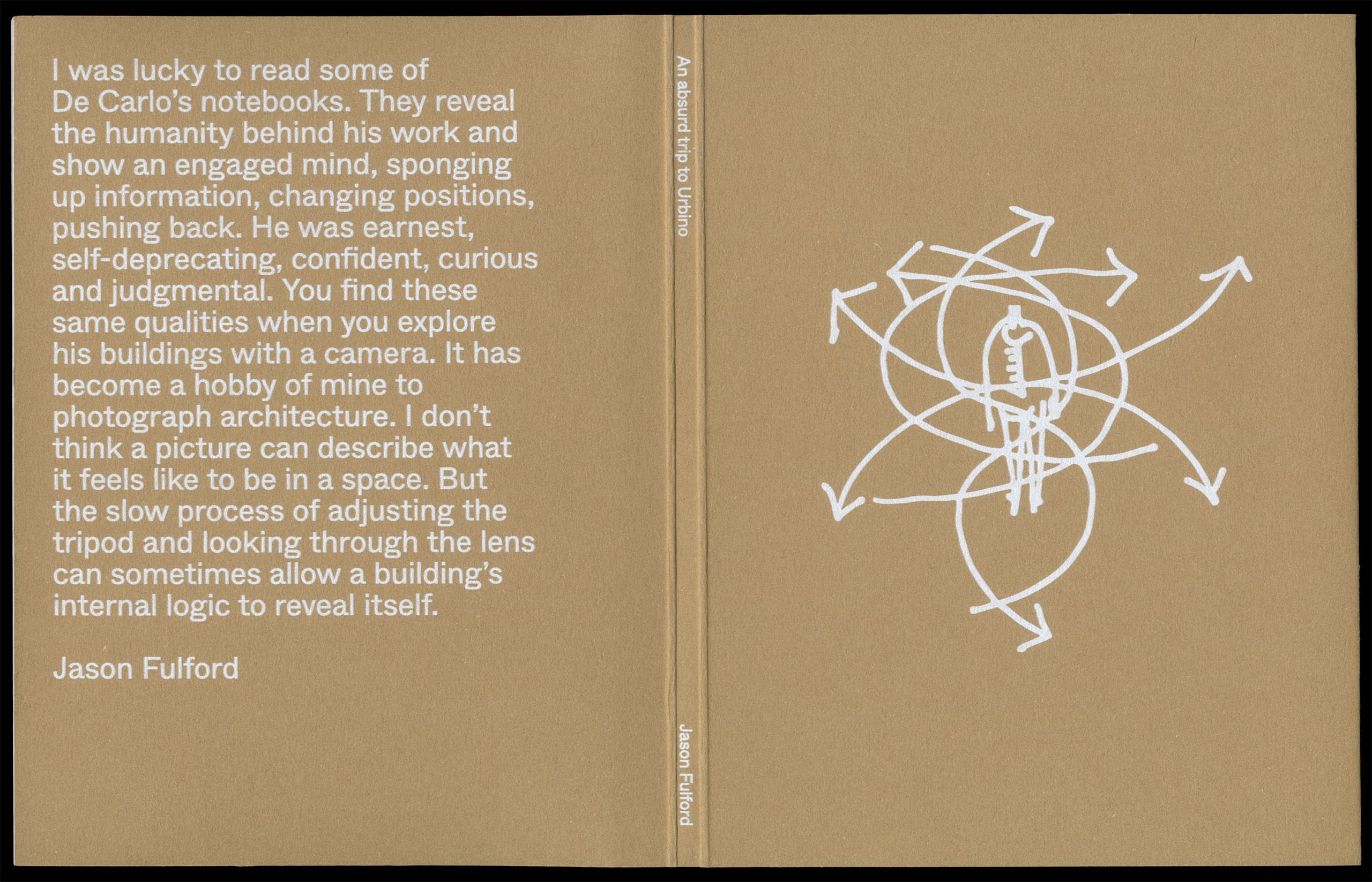 This small photography book features images by Jason Fulford made in Urbino, depicting the architecture of Giancarlo De Carlo. It includes a hypothetical dialogue between the photographer and the architect, based on the themes of heteronomy in architecture and participation. The imagined conversation attempts to bring the two into dialogue, rediscovering the meaning of that “absurd trip to Urbino” which we traverse, deliberately disoriented, through the photographs.